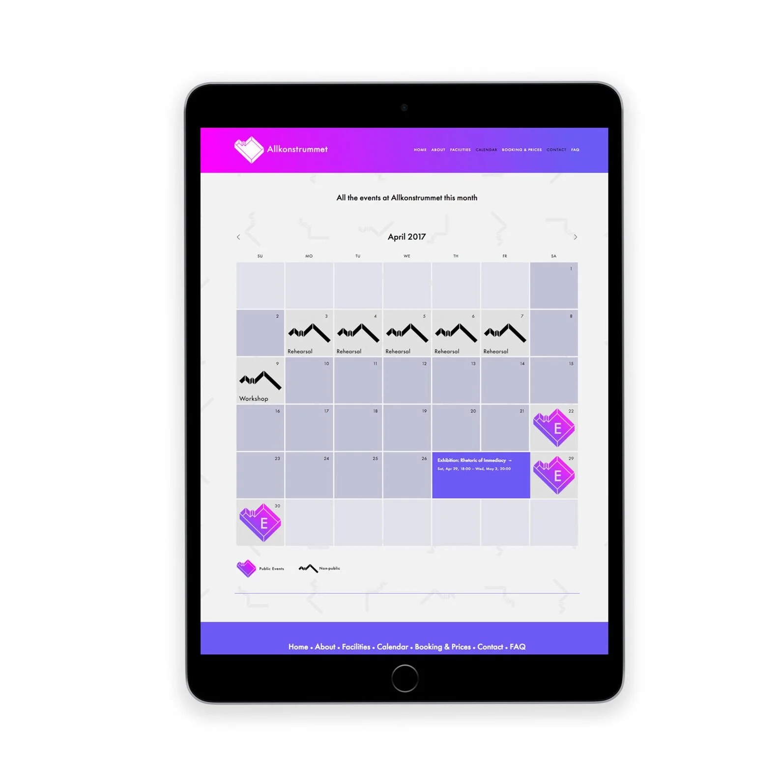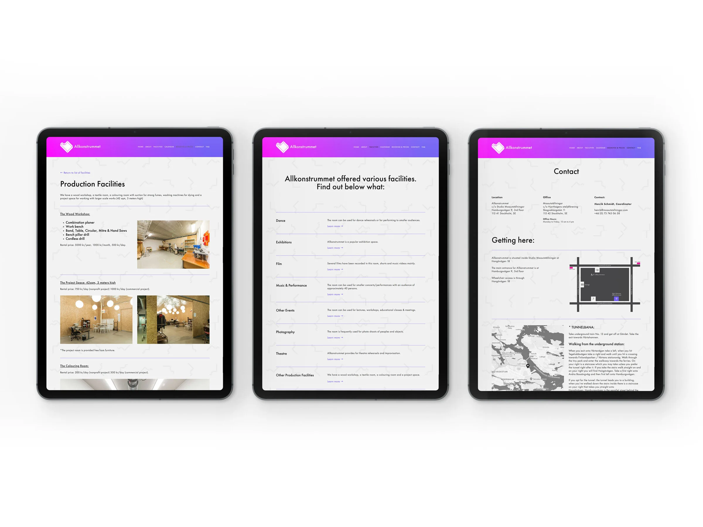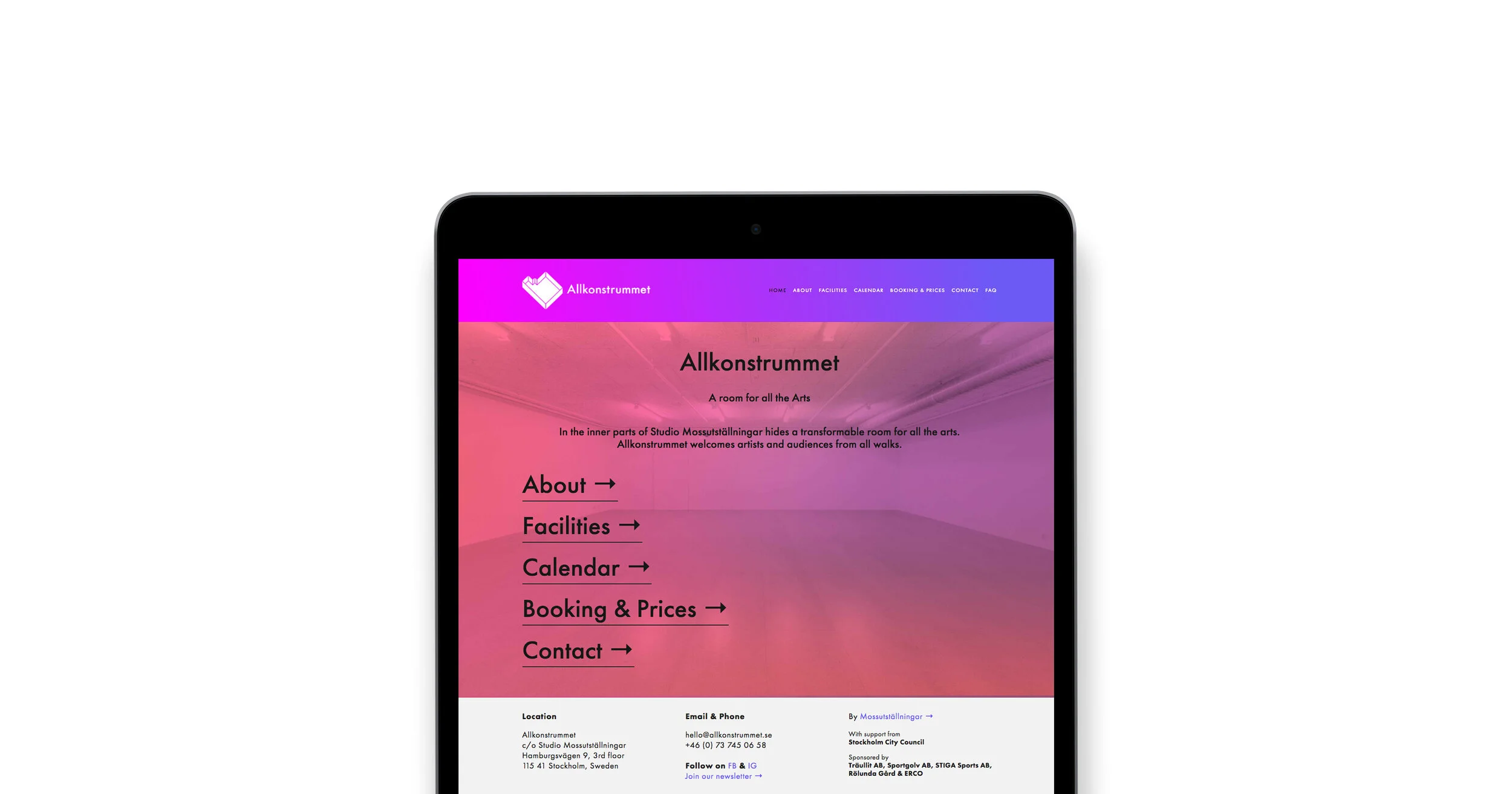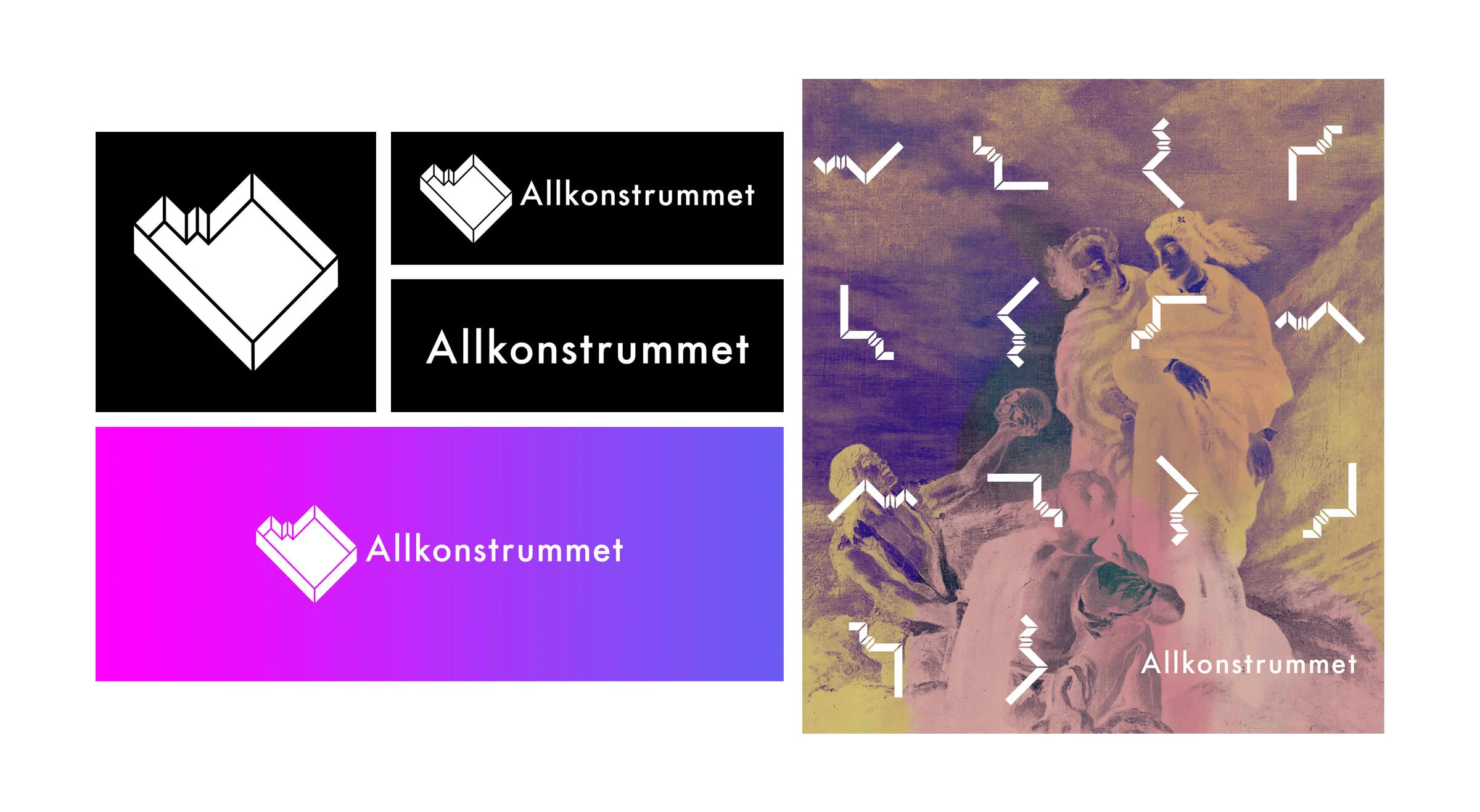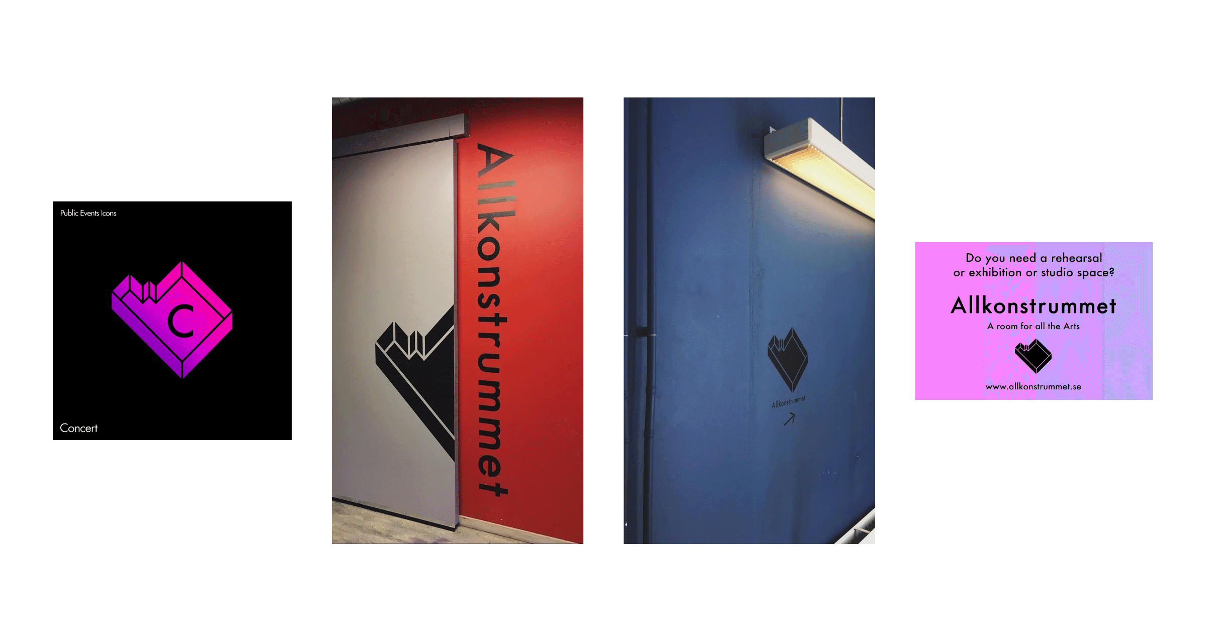 The logo is based on the transformability of the room. This idea helped to create diverse visual elements to complement the visual identity. The project also included a website for promoting the facility, booking the room and events at Allkonstrummet.